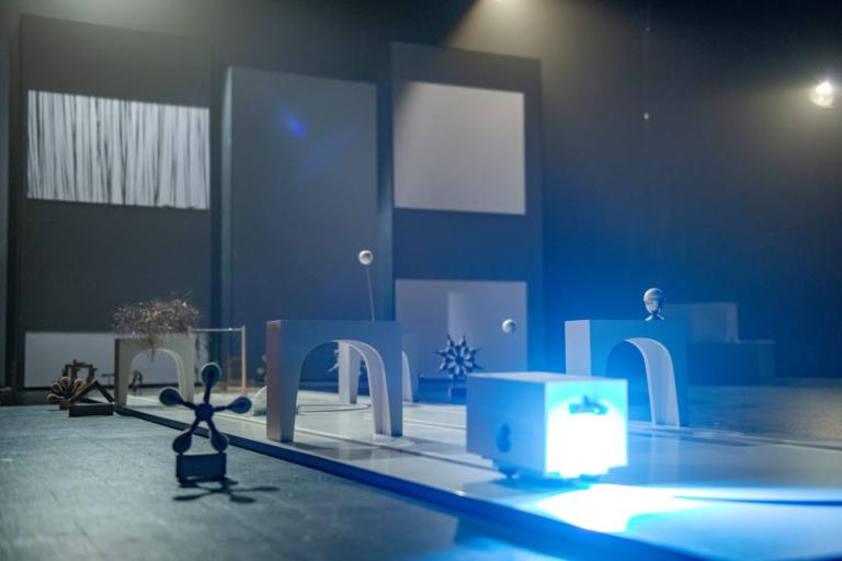 Sur scène, un piano en pièces détachées et un petit train électrique prennent vie : sa lumière éclaire les objets, crée des ombres géantes sur les murs et transforme les touches de piano en immenses buildings. Les sons du train et des mécanismes deviennent musique, et l’espace se change en terrain de jeu plein de surprises.